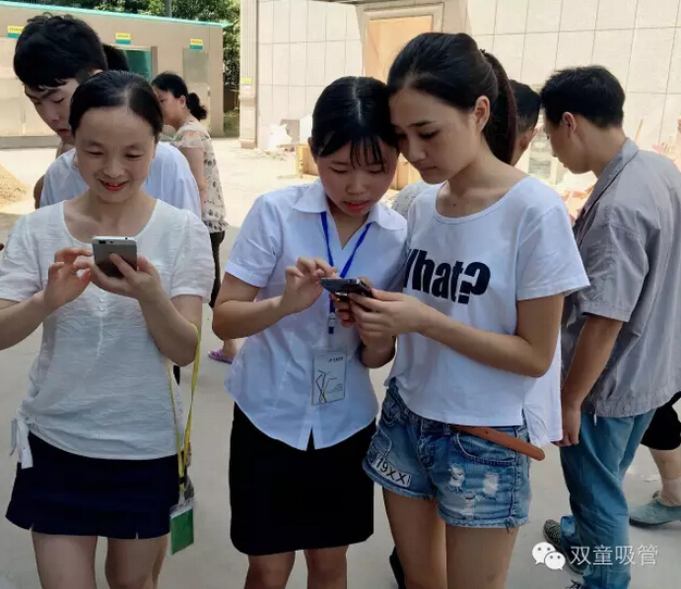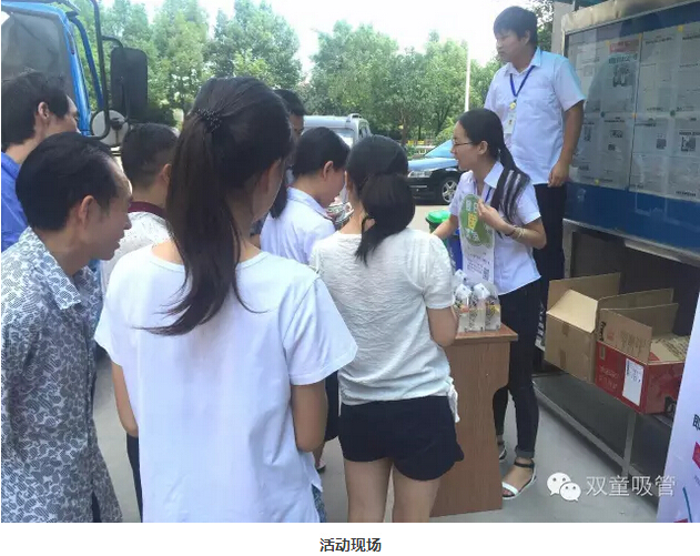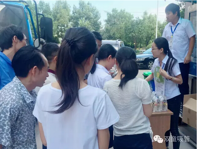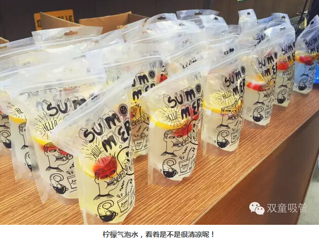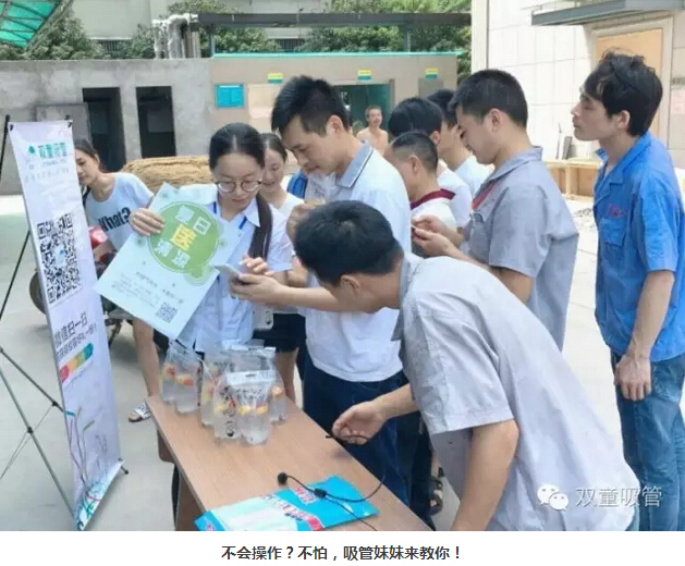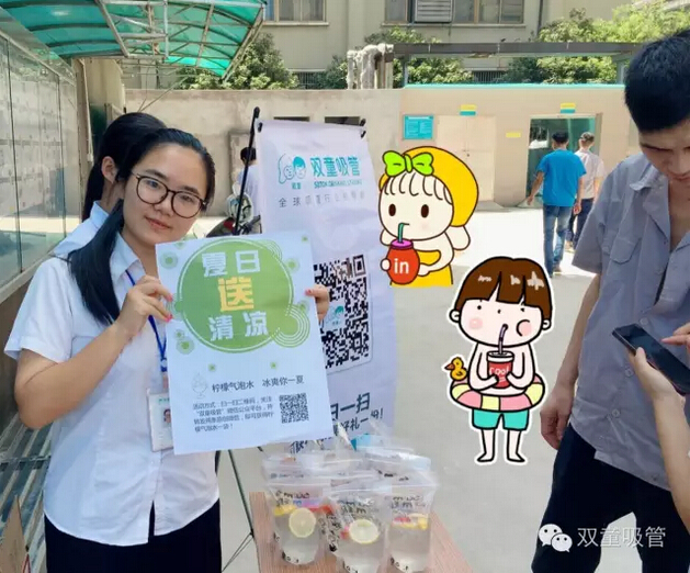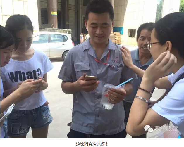 瞧!我們剛開(kāi)張,就吸引了不少正要去吃飯的員工們。原來(lái),拿到飲料的方法特別簡(jiǎn)單,只需要關(guān)注“雙童吸管”的微信公眾平臺并轉發(fā)微信,即可獲得檸檬氣泡水一袋呢!看來(lái)吸管妞為了微信的推廣也是絞盡腦汁啦!