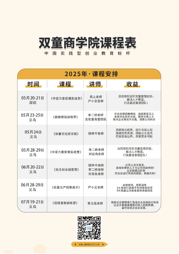 想要了解更多詳細信息,請查看下方課程詳情列表。歡迎廣大創(chuàng )業(yè)者、企業(yè)家走進(jìn)“雙童”深度學(xué)習!(文末有具體課表時(shí)間安排)