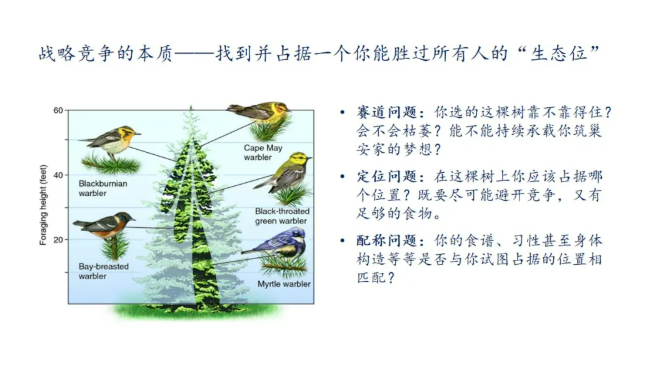 鄧地博士通過(guò)引入“5種林鶯在同一棵冷杉上棲息卻占據不同的位置”這一生物學(xué)現象,讓同學(xué)們意識到競爭的普遍性以及戰略競爭的本質(zhì),就是找到并占據一個(gè)你能勝過(guò)所有人的“生態(tài)位”。