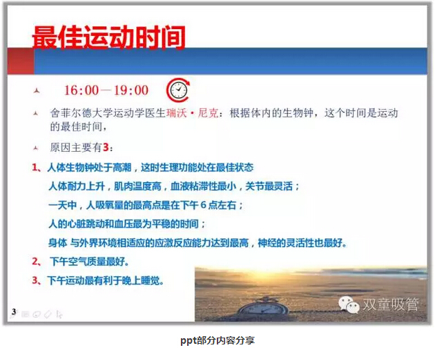 首先是朱主任給我們分享《我們應該知道的生活、運動(dòng)和傷病常識》課程,大家是不是都覺(jué)得清晨運動(dòng)是很好的健身方式,其實(shí)清晨是不宜運動(dòng)的,這時(shí)候人的身體狀態(tài)最差,最佳的運動(dòng)時(shí)間應該是16:00—19:00。在日常生活中,大家是不是都存在這樣的誤區呢?