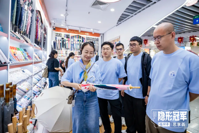 二區的商品定位是五金電子和家居用品專(zhuān)業(yè)市場(chǎng),樓老師和同學(xué)們一起實(shí)地探訪(fǎng)了多家五金工具、家電和傘類(lèi)的頭部商戶(hù),特別是在一個(gè)上個(gè)央視新聞的傘業(yè)商位前,擺滿(mǎn)了無(wú)邊角設計的兒童傘、充滿(mǎn)復古風(fēng)的國潮傘……商鋪負責人也曾說(shuō),“客戶(hù)來(lái)了,永遠都有新款,企業(yè)的生命在于與時(shí)俱進(jìn)?!蹦壳霸摴疽褤碛?000多款雨傘,產(chǎn)品附加值持續提升,不斷進(jìn)入中高端市場(chǎng),如今已出口100多個(gè)國家和地區。