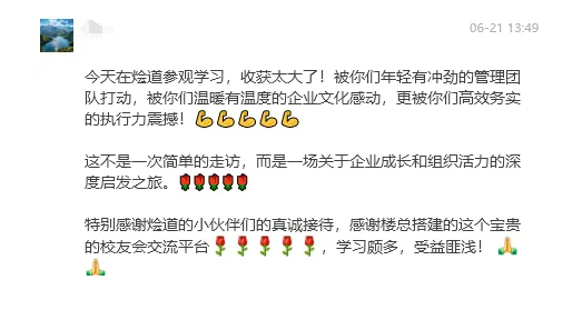 研學(xué)當天,山東校友會(huì )抵達燴道,便受到創(chuàng )始人朱濤總攜核心管理團隊及相關(guān)部門(mén)負責人的熱情迎接,還收到了精美的鮮花,在芳香中開(kāi)啟了研學(xué)之旅。