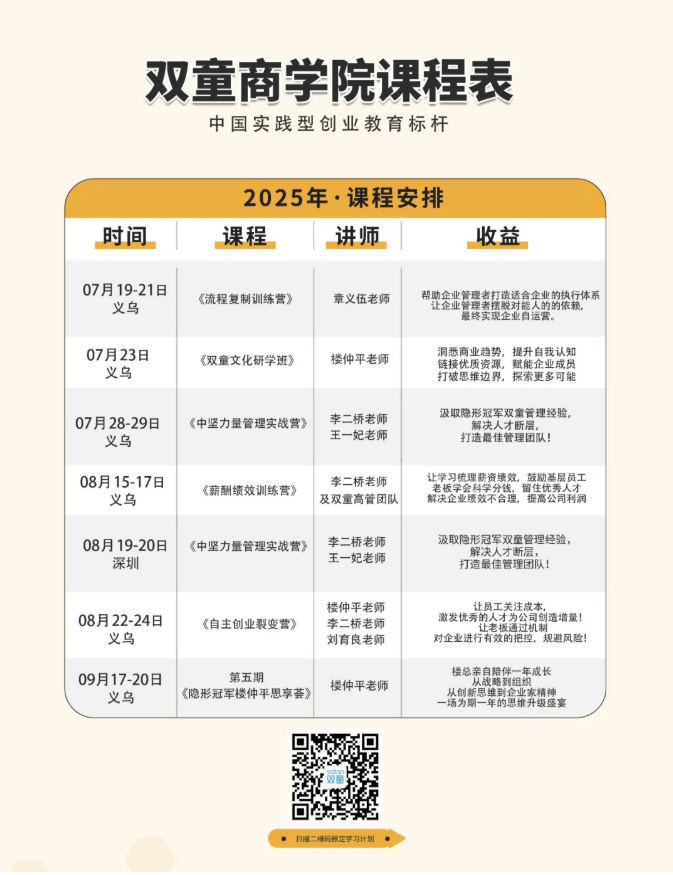 想要了解更多詳細信息,請查看下方課程詳情列表。歡迎廣大創(chuàng )業(yè)者、企業(yè)家走進(jìn)“雙童”深度學(xué)習!(文末有具體課表時(shí)間安排)