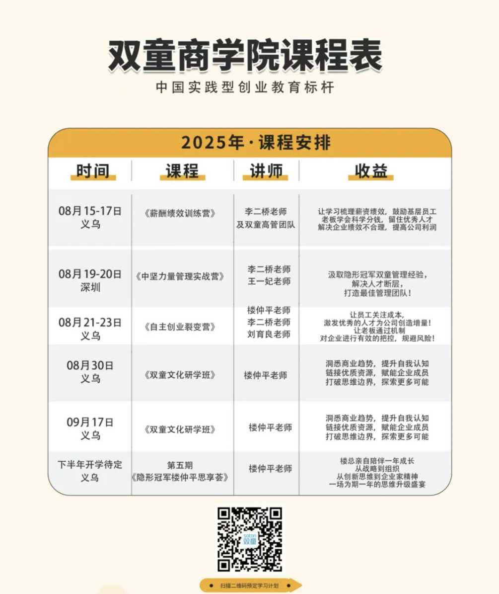 企業(yè)成長(cháng)的背后是創(chuàng )業(yè)者的持續成長(cháng),“雙童”能夠一次次成功穿越周期的背后,是創(chuàng )始人樓仲平個(gè)人的持續成長(cháng)、自我進(jìn)化的結果!也是創(chuàng )始人樓仲平47年如一日踐行"行知合一"的原因。所以在每一場(chǎng)分享中,他都將自己從草根創(chuàng )業(yè)者到行業(yè)領(lǐng)袖的進(jìn)化歷程作為開(kāi)篇,因為這正是“雙童”韌性成長(cháng)的核心密碼。