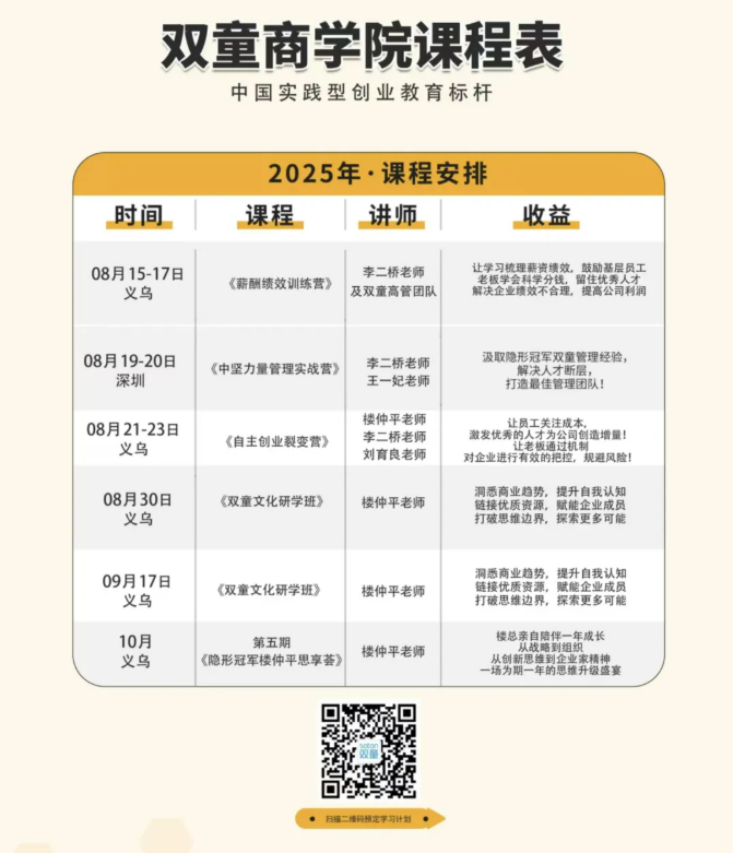 如果你也對雙童的企業(yè)管理充滿(mǎn)好奇,也想體驗雙童的中國式管理,歡迎走進(jìn)8月30日【雙童文化研學(xué)班】,與上百位優(yōu)秀的創(chuàng )業(yè)者一起學(xué)習!少量名額,歡迎咨詢(xún)鎖定!