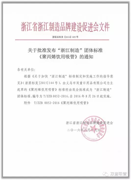 8月26日,“雙童”收到了浙江省浙江制造品牌建設促進(jìn)會(huì )發(fā)出的通知,正式通知由“雙童”為主起草的“浙江制造”團體標準《聚丙烯飲用吸管》正式發(fā)布實(shí)施!