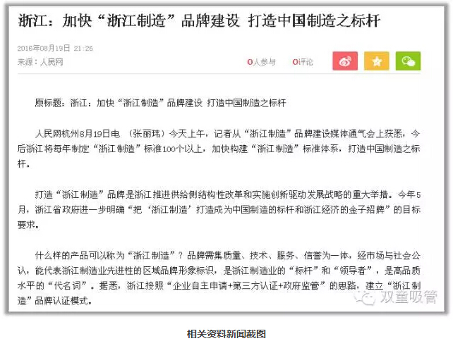 在2014年年底,浙江在全國率先以標準和認證為手段打造首個(gè)區域性公共品牌——“浙江制造”品牌。“浙江制造”標準比國家及行業(yè)標準要求要高,基本達到國際先進(jìn)、國內一流水平。4月28日,浙江省質(zhì)量技術(shù)監督局公布《2016年第一批“浙江制造”品牌重點(diǎn)培育產(chǎn)品名單》,我們“雙童”代表義烏申報的吸管產(chǎn)品名列其中。入選這份名單,標志著(zhù)義烏在“浙江制造”品牌培育方面取得了重大突破。