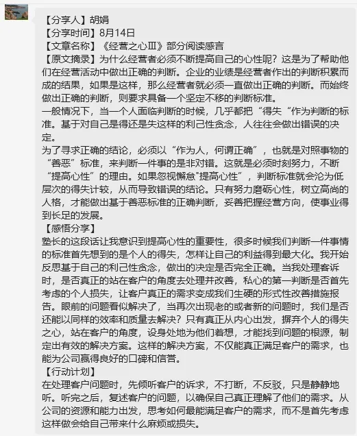 “稻盛哲學(xué)首先是我們的精神食糧,讀道生的疏會(huì )接受到巨大的能量和勇氣。高深哲學(xué)是我們邁向人生幸福的必需品、營(yíng)養品,可以滋潤我們的心,促使我們提高心性,應當成為我們的工具,每天都使用。我不僅自己要、自己讀,現在還召喚我們全體進(jìn)出口員工一起看,一起交流,讓大家同頻共振,共同進(jìn)步!”