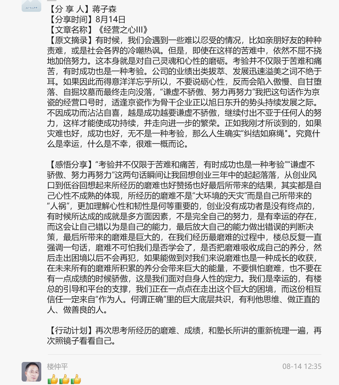 《塾生必讀18篇演講文》中將塾長(cháng)的18次經(jīng)典演講進(jìn)行匯編,內容包含稻盛哲學(xué)《經(jīng)營(yíng)之心》、《六項精進(jìn)》、《經(jīng)營(yíng)十二條》等詳細解讀,雙童塾生們每日閱讀此書(shū)并進(jìn)行學(xué)習感悟打卡。創(chuàng )始人樓仲平更是以身作則、率先垂范,分享他心中的稻盛哲學(xué),以及結合所學(xué)內容發(fā)表自己最真實(shí)的反思與感悟。