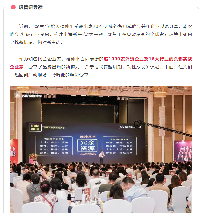 @樓仲平 受邀2025天成外貿總裁峰會(huì )!為超1000位創(chuàng )業(yè)者分享冠軍企業(yè)的“韌性成長(cháng)”之道!