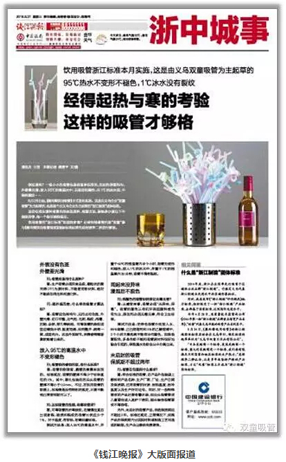 8月26日,由“雙童”主導起草的“浙江制造”團體標準《聚丙烯飲用吸管》正式發(fā)布實(shí)施!這份標準從塑料吸管的形態(tài)到原料、檢測方法、耐熱多少度以下不能變形等,每一個(gè)細節都有明確的規定。消息一出,引起了新聞媒體的高度關(guān)注。這不,浙江的權威媒體《錢(qián)江晚報》對此也進(jìn)行了大版面報道,下面妞就帶大家來(lái)看看吧!