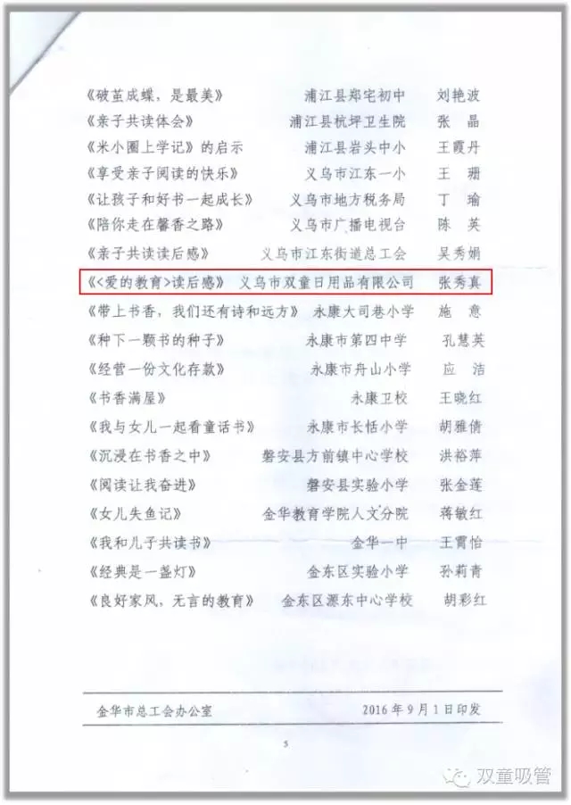 不過(guò),好消息還沒(méi)結束!沒(méi)過(guò)多久,這篇讀后感又被作為優(yōu)秀作品,參選了金華總工會(huì )的比賽評選,并獲得了優(yōu)秀獎呢!吸管妞仔細看了一下,沒(méi)想到“雙童”竟然是所有60家獲獎單位里唯一一家企業(yè)單位呢!要知道,參加這類(lèi)比賽并且獲獎的基本上可都是各大學(xué)校和事業(yè)單位??!我們的“雙童”寶貝是不是很棒呢!下面妞就把這篇讀后感放上來(lái)和大家共享,一起和孩子感受“愛(ài)的教育”吧!