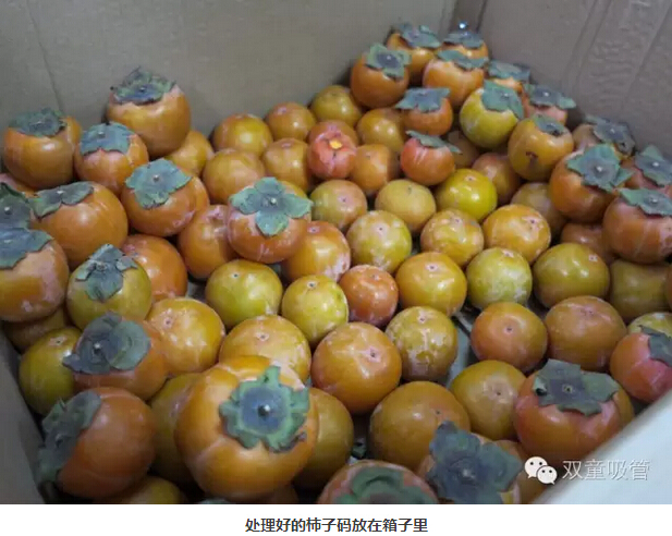 采摘下來(lái)的柿子將枝椏剪掉,再涂抹上一點(diǎn)藥酒,整齊地碼放在箱子里,密封三四天,柿子們就澀味盡除,甘甜如蜜啦!