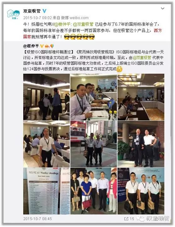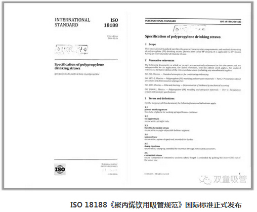 2016年6月27日,瑞士ISO標準化管理組織正式向全球162個(gè)成員國下發(fā)了《聚丙烯飲用吸管規范》ISO國際標準文本。至此,歷經(jīng)九年,輾轉六國,由“雙童”代表中國主持起草的《聚丙烯飲用吸管規范》ISO國際標準終于大功告成!標準起草編制工作圓滿(mǎn)完成。