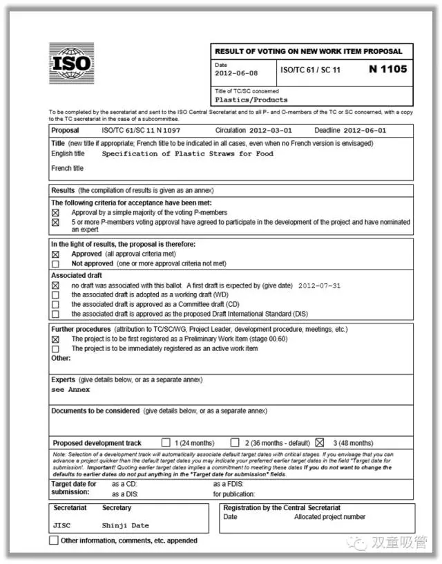 ISO國際標準化組織下發(fā)的《聚丙烯飲用吸管規范》標準任務(wù)書(shū)