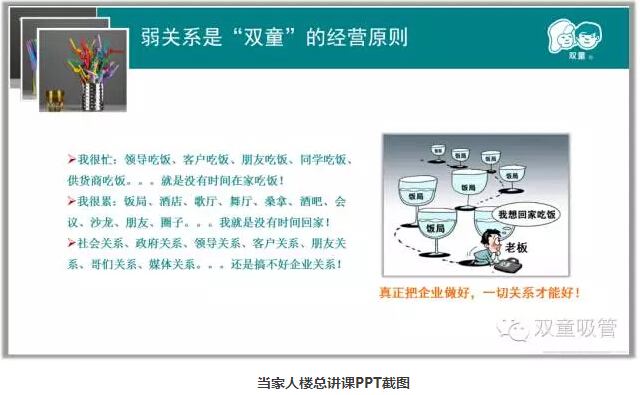 在現代社會(huì )中,不少人把企業(yè)經(jīng)營(yíng)管理與人情社交關(guān)系掛上鉤,認為”朋友多好辦事“。而當家人樓總卻一直認為,朋友多并不一定好辦事,有時(shí)候甚至會(huì )阻礙你的發(fā)展!這話(huà)從何說(shuō)起呢?接下來(lái)吸管妞就向大家詳細闡釋一下當家人樓總在經(jīng)營(yíng)“雙童”過(guò)程中一直堅守的“企業(yè)強弱關(guān)系”理念吧!