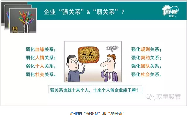 我們要弱化人情關(guān)系,強化契約關(guān)系:在“雙童”,我們盡量減少人情上的關(guān)系,把工作以契約的形式加以固定,這樣也少了許多復雜的人情困擾。