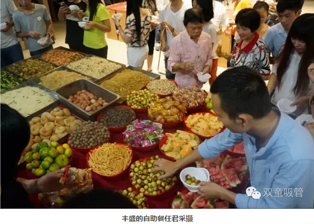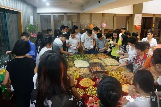 人數這么多,吃得也得升級呀!為了讓壽星們吃飽喝足,我們的后勤部門(mén)也是準備了一大桌的美食。這不,瓜果點(diǎn)心、糖果糕點(diǎn)、精致小菜、葡萄酒、啤酒、各種飲料,都以自助餐的形式任君采擷!你要不吃飽喝足,你都不好意思出這個(gè)門(mén)呀!