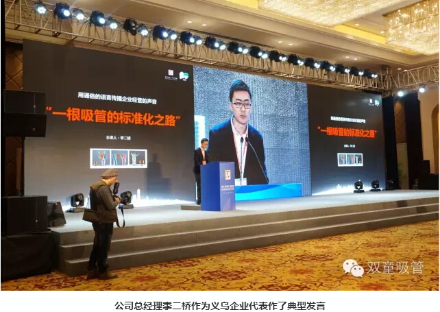 11月18日,2016“浙江制造”標準發(fā)布會(huì )暨“浙江制造”品牌發(fā)布展示平臺啟動(dòng)儀式在義烏舉行,省副秘書(shū)長(cháng)陸建強、省標準委員會(huì )、質(zhì)量監督局的相關(guān)領(lǐng)導及義烏市委市政府的盛秋平書(shū)記、林毅市長(cháng)等主要領(lǐng)導都出席了本次儀式。義烏首個(gè)“浙江制造”標準研制企業(yè)雙童吸管派出了總經(jīng)理李二橋作為代表作了典型發(fā)言!