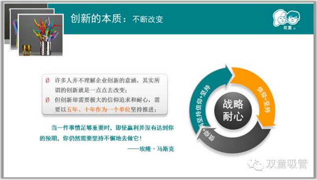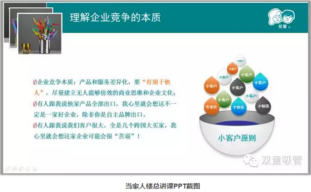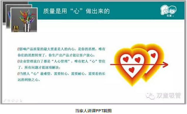 首先,當家人樓總分享了自己30多年的創(chuàng )業(yè)經(jīng)歷,在不斷失敗的教訓中,他選擇了把一根吸管做精、做細!通過(guò)二十多年積累,“雙童”初步形成了專(zhuān)注經(jīng)營(yíng)、創(chuàng )新進(jìn)取、綠色低碳、和諧共贏(yíng)和精細化管理的發(fā)展理念,“雙童”也發(fā)展的越來(lái)越好!而這些都離不開(kāi)“匠心”。社會(huì )發(fā)展也是如此,逐漸回歸“匠心”,回歸商業(yè)本質(zhì)!
