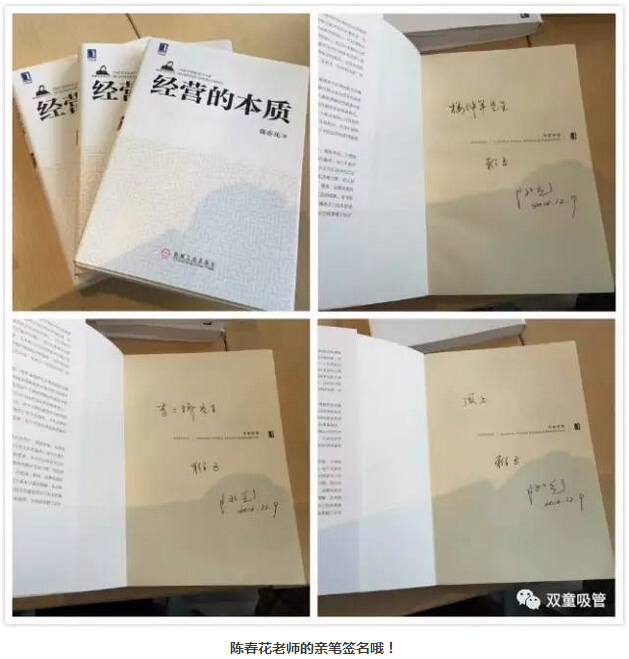 百聞不如一見(jiàn),吸管妞今兒可算見(jiàn)到真人啦,內心十分激動(dòng)呢,趕緊拿出事先準備好的陳老師的大作《經(jīng)營(yíng)的本質(zhì)》請她請簽名。當家人樓總也化身為小粉絲,簽完名后陳老師和當家人樓總進(jìn)行了簡(jiǎn)單的交流。