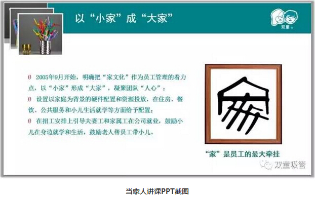 當家人樓總始終認為只有員工幸福企業(yè)才能幸福,只有改變員工才能改變產(chǎn)品從而改變企業(yè)。“雙童”意識到“人心管理”就是“人性”的需求管理,是企業(yè)生態(tài)系統建設的源頭問(wèn)題。所以“雙童”明確把“家文化”作為員工管理的著(zhù)力點(diǎn),以“小家”形成“大家”。除了給員工提供優(yōu)質(zhì)硬件,從生態(tài)上保障員工珍惜環(huán)境所在,同時(shí)通過(guò)意識引導、規則管理讓員工的觀(guān)念進(jìn)行轉變,從而用“心”生產(chǎn)出更好的產(chǎn)品!