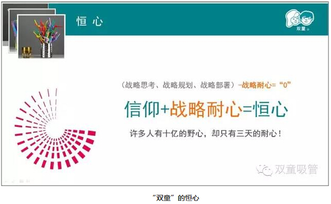 從一根簡(jiǎn)單的不能再簡(jiǎn)單的吸管,到今天“雙童”琳瑯滿(mǎn)目的創(chuàng )意吸管,“雙童”的吸管已不再是簡(jiǎn)單喝飲料了,幾厘錢(qián)的吸管逐漸地變成了幾毛錢(qián)、幾塊錢(qián),甚至于我們的吸管都可以賣(mài)到十塊錢(qián)、八塊錢(qián)一支了。而取得這樣的創(chuàng )新突破,絕非是一朝一夕的短、平、快,而是以“十年為一個(gè)單位”的持續積累而一點(diǎn)點(diǎn)的突破。