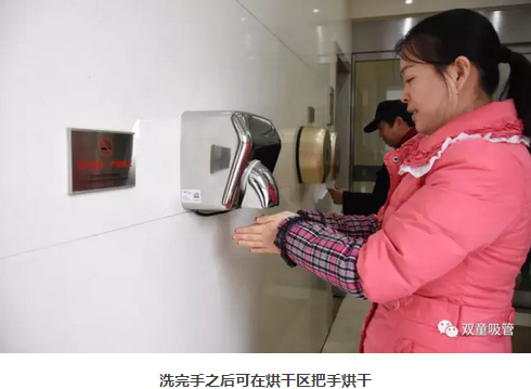 在洗手區,俯身洗手時(shí),你會(huì )看見(jiàn)墻面上溫馨的提示語(yǔ):“洗手臺盆,保持清潔;請勿將大量的水濺出臺盆濺濕地面”。洗完手之后,員工可以在烘干區把手烘干。