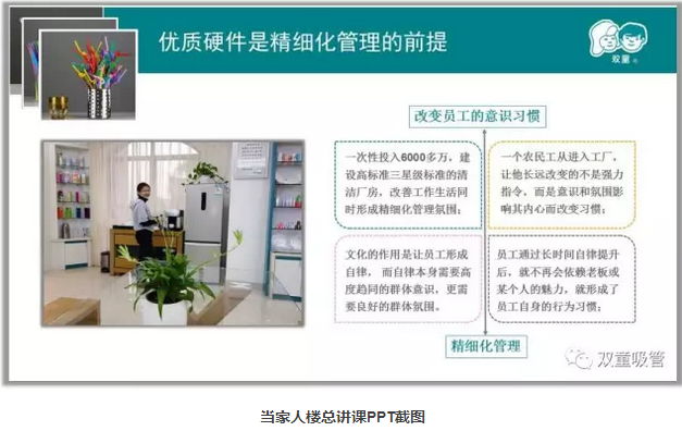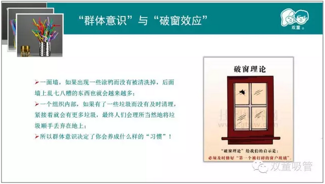 當家人樓總常說(shuō)廁所應該是一個(gè)企業(yè)最干凈的地方,連廁所都打掃不干凈的企業(yè),怎么可能生產(chǎn)出讓人放心的產(chǎn)品!環(huán)境會(huì )潛移默化地影響員工的素養,環(huán)境不好則會(huì )產(chǎn)生破窗效應。一個(gè)組織內部,如果有了一些垃圾沒(méi)有及時(shí)清理,就會(huì )有更多的垃圾。個(gè)體習慣依附于“群體意識”,“群體意識”決定了你會(huì )養成什么樣的習慣,員工的習慣影響著(zhù)員工會(huì )做出怎樣的產(chǎn)品,因此優(yōu)質(zhì)硬件是精細化管理的前提,同時(shí)意識引導也至關(guān)重要!