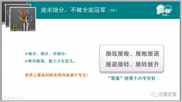 其實(shí)真正把自己的產(chǎn)品做好了,企業(yè)在一定時(shí)候擴大規模才是自然而至!“雙童”的發(fā)展始終伴隨著(zhù)不斷地放棄,在自己的領(lǐng)域里細分細分再細分,把一根吸管做到極致!在利他的基礎上不斷堅持,懂得放棄,關(guān)注事物本身,回歸商業(yè)本質(zhì)!