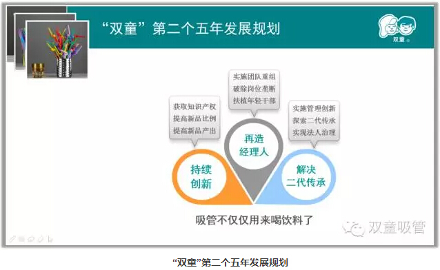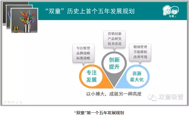 在同質(zhì)化競爭日益激烈的大背景下,促使著(zhù)“雙童”放棄做低端的吸管,做中高端產(chǎn)品。早在2005年,“雙童”頒布的第一個(gè)五年發(fā)展規劃中就提出了“創(chuàng )新提升”的關(guān)鍵詞。接下來(lái)兩個(gè)五年發(fā)展規劃中也提出了“持續創(chuàng )新”、“開(kāi)展有效創(chuàng )新”的關(guān)鍵詞,以此作為今后的方向目標和理念。