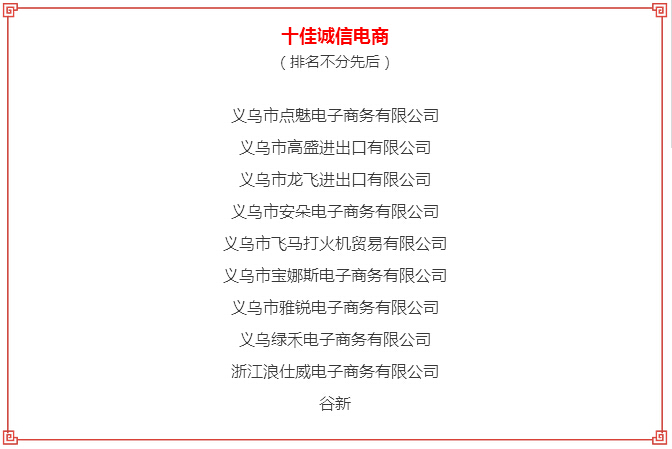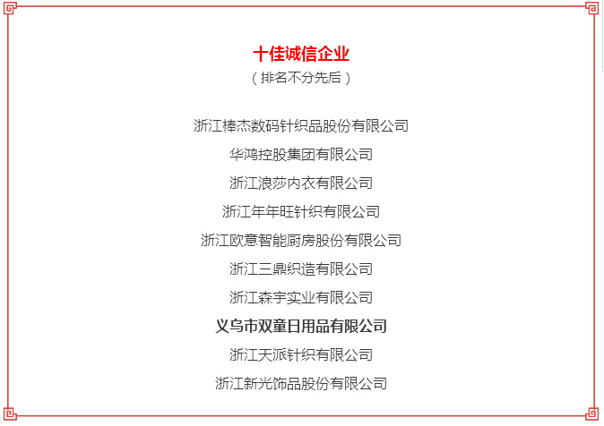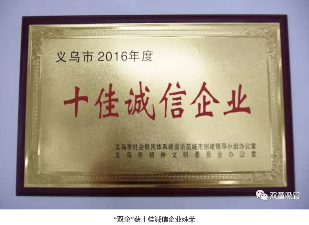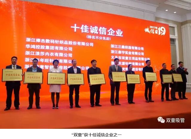 1月9日上午,義烏市2017年“誠信日”暨“義烏中國小商品城”品牌授權儀式在幸福湖隆重舉行!為褒揚守信主體、營(yíng)造誠信氛圍,當天還舉行了首屆守信“紅名單”發(fā)布儀式,為“十佳誠信企業(yè)”、“十佳誠信外商”、“十佳誠信電商”和“十佳誠信經(jīng)營(yíng)戶(hù)”授牌。“雙童”也名列其中,成為“十佳誠信企業(yè)”之一!