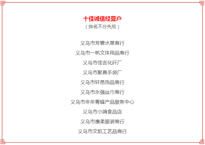 因為有你們的鼓勵,“雙童”一定會(huì )履行誠信諾言:對社會(huì )誠信、對環(huán)境誠信、對政府誠信、對員工誠信、對顧客誠信、對他人誠信。施誠立企、以誠立人,樹(shù)立誠信、傳播誠信,形成誠信的氛圍,推動(dòng)義烏有序、有信、又好、又快的持續發(fā)展!