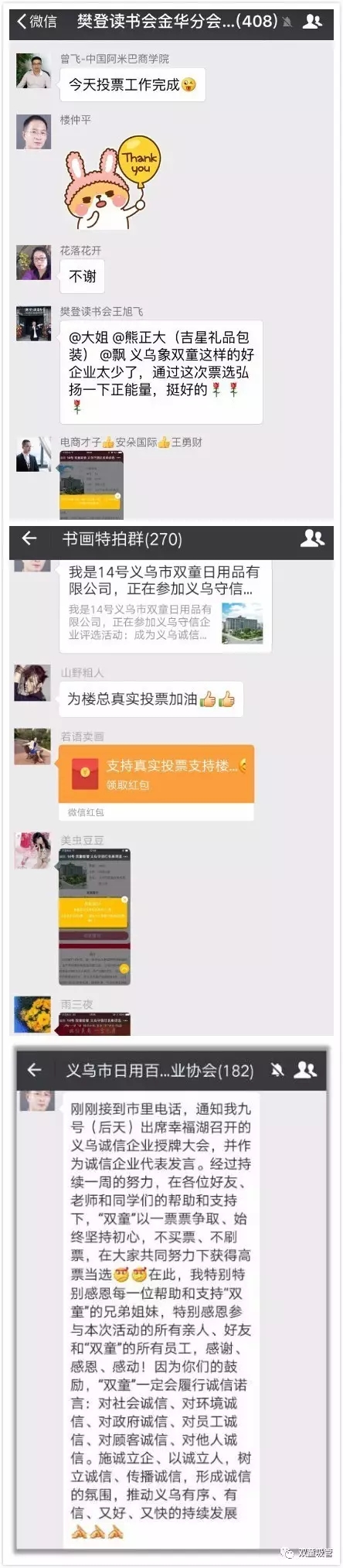 很多好友都積極幫“雙童”投票,吸管妞在此特別感恩每一位支持“雙童”的兄弟姐妹,感恩參與此次活動(dòng)的所有好友、粉絲和“雙童”的所有員工們!在此特別感謝樊登讀書(shū)會(huì )和書(shū)畫(huà)特拍群的好友們,每天都堅持為“雙童”投票,除此之外,還引導自己朋友圈的好友們?yōu)?/span>“雙童”投票,感謝大家支持!