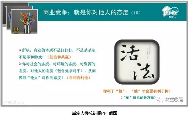 接下來(lái),樓總分享了“匠人思維”的商業(yè)本質(zhì),商業(yè)在本質(zhì)上就像“生物依賴(lài)于環(huán)境”,直接或間接地依賴(lài)客觀(guān)上存在的社會(huì )、組織和個(gè)體當中,并形成相互依存、彼此共存的經(jīng)濟共同體。所以,商業(yè)的本質(zhì)不是打打打,不是殺殺殺,不是零和游戲!