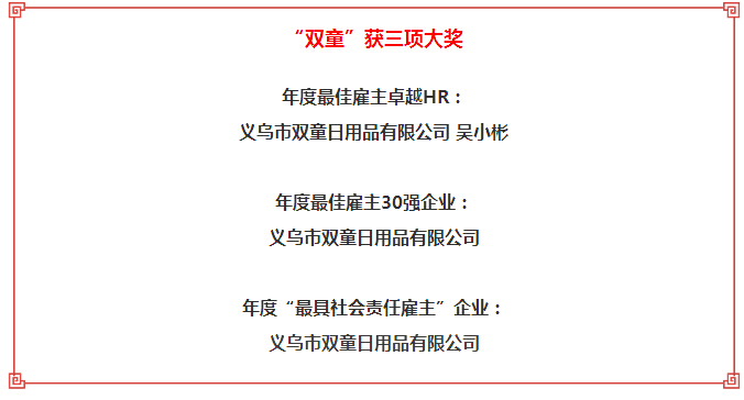 1月10日下午,“我的企業(yè)我的家”2016義烏最佳企業(yè)文化暨“最佳雇主”評選頒獎典禮在義烏工商學(xué)院舉行,近百位企業(yè)負責人共同見(jiàn)證了義烏新一屆“最佳雇主”的誕生!“雙童”也名列其中,被評為2016中國義烏年度"最佳雇主"及“最具社會(huì )責任雇主”企業(yè),副總吳小彬也被評為年度最佳雇主卓越HR!其實(shí)“雙童”一直以來(lái)都十分重視員工關(guān)懷,下面妞就帶大家來(lái)看看“雙童”是如何做的吧!