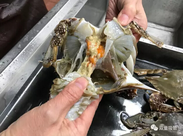 十二、取出砂囊后將蟹身兩側的蟹鰓(看上去像魚(yú)鰓)用手工拔除干凈,如果蟹鰓底部有烏黑砂子,千萬(wàn)不要用清水沖洗,用干凈牙刷局部清洗一下就可以了。