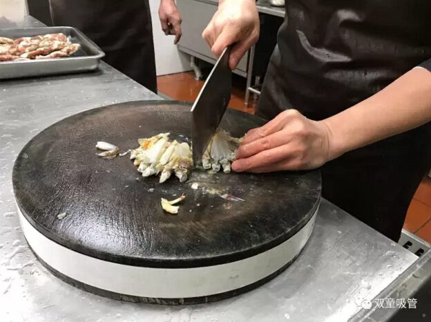十三、螃蟹宰殺完畢后放菜板將蟹腳去除,大腳砍成三段、小腳砍成兩段。