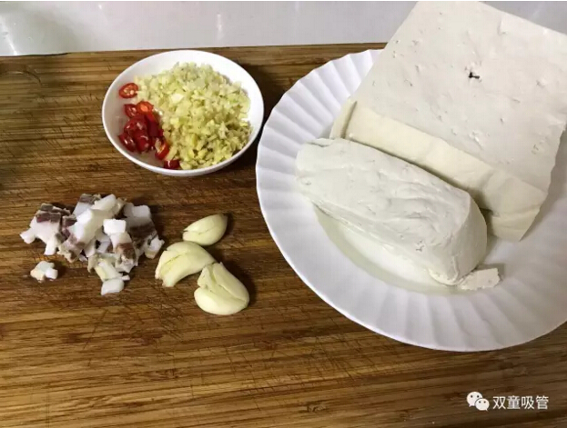 十九、準備適量火腿,準備新鮮的鹽鹵嫩豆腐,一般一斤螃蟹配3斤左右豆腐,豆腐一定要新鮮水嫩。