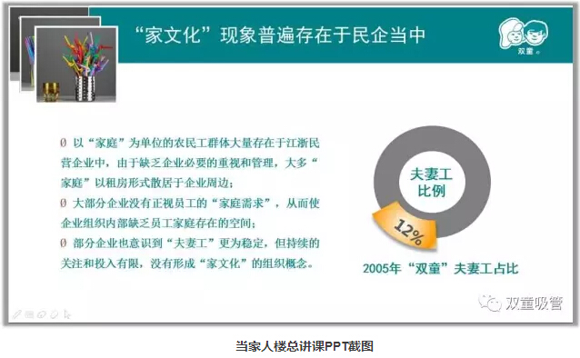 如今,“家文化”現象普遍存在于民企之中,農民工當中的“夫妻工“等親屬關(guān)系已經(jīng)非常正常。而“雙童”也不例外,但在形成“雙童”獨有的“家文化”過(guò)程背后,也有一個(gè)小故事。