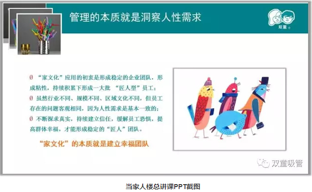 你對員工的態(tài)度本質(zhì)上來(lái)說(shuō)就是員工對你的態(tài)度,人性的需求是一致的。“家文化”應用的初衷是形成穩定的企業(yè)團隊,形成粘性,持續積累下形成一大批 “匠人型”員工。只有不斷探求真實(shí),持續建立信任,緩解員工恐懼,提高群體幸福,才能形成穩定的“匠人”團隊,“家文化”的本質(zhì)就是建立幸福團隊!