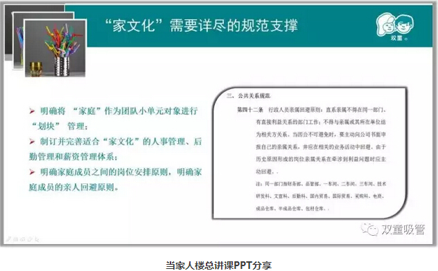 當家人樓總答:“雖然‘雙童’倡導家文化,但我們用目標、責任、權利來(lái)聯(lián)結,用各種制度規范來(lái)支撐‘家文化’理念。‘雙童’明確將 ‘家庭’作為團隊小單元對象進(jìn)行‘劃塊’管理,制訂并完善適合家文化的人事管理、后勤管理和薪資管理等體系。明確家庭成員之間的崗位安排原則,明確家庭成員的親人回避原則。對上下級關(guān)系處理、紅白喜事處理、收受禮物等方面都有著(zhù)嚴格的規定!”