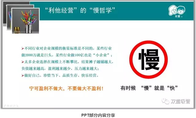 “利他經(jīng)營(yíng)”的慢哲學(xué):太多企業(yè)選擇在規模上不斷攀比,結果攤子越鋪越大,負債越來(lái)越高,盈利越來(lái)越少,壓力越來(lái)越大。其實(shí)“慢”的本質(zhì)是不犯錯誤少走彎路,不斷積累,有時(shí)候“慢”就是“快”!