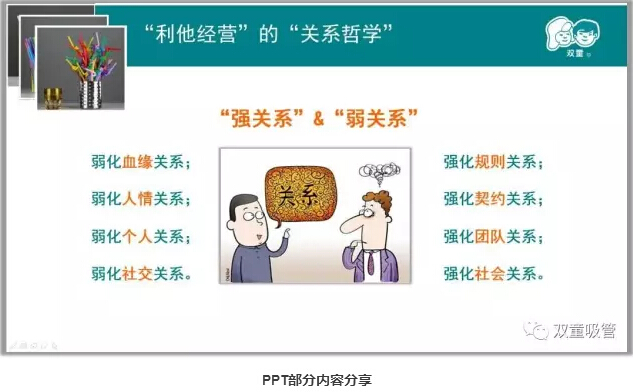 “利他經(jīng)營(yíng)”的“關(guān)系哲學(xué)”:企業(yè)如何通過(guò)引導讓關(guān)系達到最優(yōu)配置?“雙童”樓仲平十分注重關(guān)系哲學(xué),通過(guò)弱化血緣關(guān)系,強化規則關(guān)系;弱化人情關(guān)系,強化契約關(guān)系;弱化個(gè)人關(guān)系,強化團隊關(guān)系;弱化社交關(guān)系,強化社會(huì )關(guān)系,從而為企業(yè)持續發(fā)展創(chuàng )造良好條件!