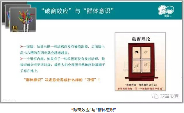 就好比剛來(lái)“雙童”的新員工,剛進(jìn)廠(chǎng)門(mén)的時(shí)候會(huì )隨地吐痰??墒沁^(guò)了一段時(shí)間,看到大家都不會(huì )這么做,再加上在干凈整潔的環(huán)境下也不好意思再隨地吐痰。久而久之,自身的壞習慣也慢慢地消失,養成了好的行為習慣!