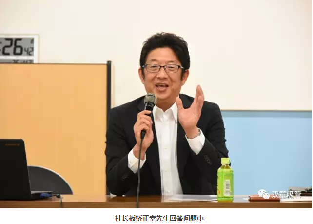 6月7日上午,“雙童”游學(xué)團來(lái)到專(zhuān)注于制作加工100%有機食品的高橋醬料株式會(huì )社。接待我們的常務(wù)董事高橋義揚是第三代繼承人,據他介紹,高橋醬料株式會(huì )社成立于1946年,現在專(zhuān)注于制作100%天然有機醬料。目前公司共有65人,平均年齡在35歲左右,但是最老的員工已經(jīng)在這里工作了30年,這點(diǎn)也讓大家非常驚訝。
