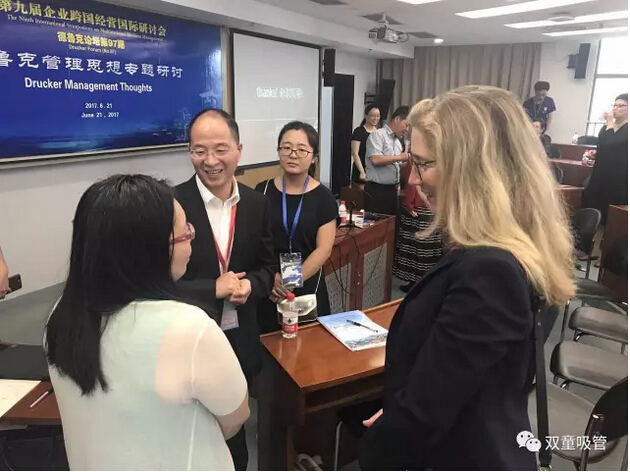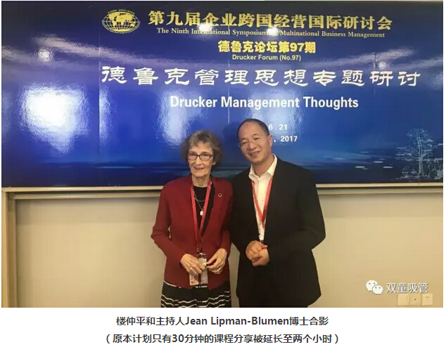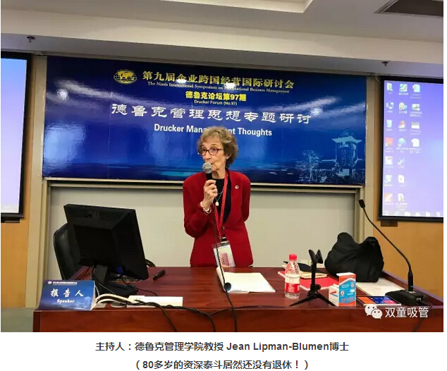 論壇正式開(kāi)始,現場(chǎng)來(lái)了很多著(zhù)名的國外學(xué)者,有英文同聲翻譯對分享者的課程進(jìn)行翻譯,大家圍繞德魯克管理思想進(jìn)行專(zhuān)題探討!此次論壇的主持人是來(lái)自美國彼得?德魯克管理學(xué)院教授Jean Lipman-Blumen博士,80高齡的她特地從美國來(lái)到中國參加此次跨國經(jīng)營(yíng)國際論壇!