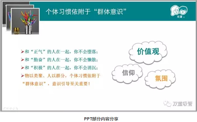在企業(yè)中,管理的最高境界是自律,而自律就需要每個(gè)人改變自己,繼而形成高度統一的“群體意識”。因此,所有人的習慣都和企業(yè)有很大的關(guān)系,物以類(lèi)聚、人以群分,個(gè)體習慣依附于“群體意識”,意識引導至關(guān)重要!