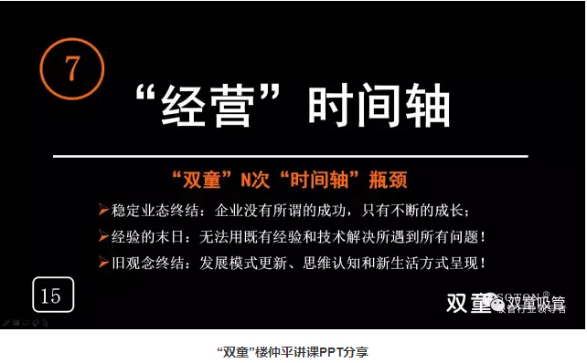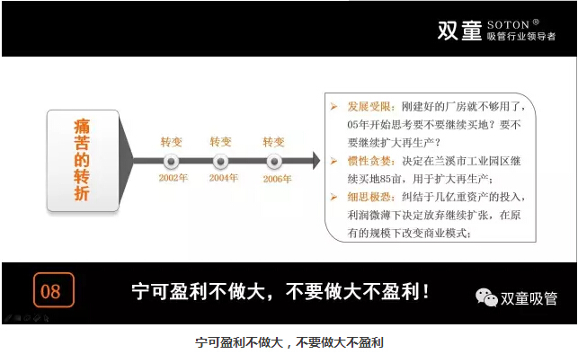 未來(lái)十年,“雙童”將繼續轉變商業(yè)模式,在規模上保持適量擴張,實(shí)施機器換人提高產(chǎn)出效率,重塑流通渠道,提高市場(chǎng)占比!“適當的規模”未必跟硬資產(chǎn)規模、產(chǎn)值、員工數成正比,不同行業(yè)對企業(yè)“適當的規模”應該有不同的認知和判斷,根據企業(yè)經(jīng)營(yíng)“時(shí)間軸”變化做相應調整來(lái)改變“雙童”未來(lái)在行業(yè)當中的地位!