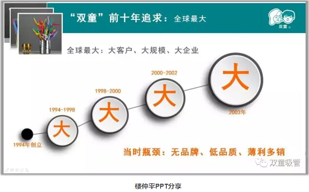 “雙童”樓仲平也坦言:“雙童”在初期的發(fā)展和義烏許多民營(yíng)企業(yè)一樣,前十年也追求全球最大,但是當時(shí)產(chǎn)生的瓶頸是無(wú)品牌、低品質(zhì)、薄利多銷(xiāo)。但2003年之后,“雙童”基于當時(shí)企業(yè)界盲目的國際化浪潮,“雙童”選擇了國內與國外市場(chǎng)并舉,明確將市場(chǎng)開(kāi)拓的中心轉移到國內市場(chǎng),明確開(kāi)始在國內市場(chǎng)投放廣告推廣,逐漸向品牌化、個(gè)性化、精細化轉變。